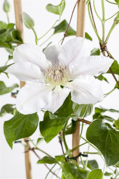 Clematis Hybride ‘Yukikomachi’, die elegante Waldrebe für stilvolle Gartengestaltung, verbindet eine kompakte Wuchsform mit zarten, edlen Blüten. Die großblütige Kletterstaude zeigt von Mai bis Juni ihre Hauptblüte und begeistert häufig mit einer zweiten Blühwelle von August bis September. Die schalenförmigen, etwa mittelgroßen Blüten präsentieren sich in sanftem Weiß mit zart rosigem bis lilacfarbenem Hauch und feinen, cremegelben Staubgefäßen, was an Pergola, Spalier oder Obelisk eine besonders harmonische Wirkung entfaltet. Das frischgrüne, sommergrüne Laub bildet einen dichten Hintergrund und betont die filigrane Anmut der Blüten. Mit ihrer eher kompakten Höhe ist ‘Yukikomachi’ ideal für den Vorgarten, als Kletterpflanze im Staudenbeet, zur zarten Fassadenbegrünung oder als Kübelpflanze auf Terrasse und Balkon geeignet; auch als Solitär an einer Rankhilfe oder als romantischer Rosenbegleiter setzt sie wirkungsvolle Akzente. Ein sonniger bis halbschattiger Standort ist optimal, wobei die Regel “Kopf in der Sonne, Füße im Schatten” für reiche Blüte sorgt: Den Wurzelbereich kühl und schattiert halten, etwa durch Mulch oder niedrige Stauden. Der Boden sollte humos, nährstoffreich, gleichmäßig feucht und gut durchlässig sein; Staunässe vermeiden. Eine Rankhilfe ist erforderlich. In der Pflege erweist sich die Sorte als angenehm unkompliziert: Im Frühjahr moderat düngen, während der Wachstumsphase gleichmäßig gießen, und in Schnittgruppe 2 im Spätwinter leicht auf etwa 80–120 cm einkürzen sowie nach der ersten Blüte auslichten, um die Nachblüte zu fördern.