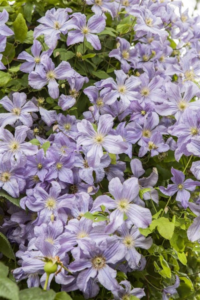 Clematis viticella ‘Prince Charles’, die Italienische Waldrebe, ist eine elegante Kletterpflanze mit reichblühendem Charakter und beeindruckender Blütenfülle. Ihre zahlreichen, zart lavendelblauen bis lichtvioletten Blüten mit leicht gewellten Tepalen und cremeweißen Staubgefäßen erscheinen über einen langen Zeitraum von Juni bis in den September und setzen an Rankgittern, Pergolen, Rosenbögen und Zäunen leuchtende Akzente. Das mittelgrüne, gefiederte Laub bildet einen frischen Kontrast und unterstreicht die luftige, kletternde Wuchsform, die je nach Standort und Schnitt auf etwa 2 bis 3 Meter heranwächst. Als Rankpflanze eignet sich ‘Prince Charles’ hervorragend für die Fassadenbegrünung, als Solitär am Obelisken, für kombinierte Pflanzungen mit Kletterrosen oder als dekorative Kübelpflanze auf Terrasse und Balkon, wo sie als blühende Kletterstaude jeden Sitzplatz aufwertet. Ein sonniger bis halbschattiger Standort mit durchlässigem, humosem und gleichmäßig frischem Boden fördert eine üppige Blüte; Staunässe sollte vermieden werden. Bewährt ist das Clematis-Prinzip „Kopf in der Sonne, Füße im Schatten“: die Wurzelscheibe beschatten oder mulchen, damit der Wurzelbereich kühl bleibt. Regelmäßiges Gießen in Trockenphasen sowie eine moderate Nährstoffversorgung mit Kompost im Frühjahr halten die Blütenrebe vital. Diese viticella-Sorte gehört zur Rückschnittgruppe 3 und wird im Spätwinter kräftig auf 30 bis 50 cm zurückgeschnitten, was einen kompakten, blühfreudigen Neuaustrieb fördert. Robust, pflegeleicht und vielseitig einsetzbar bereichert Clematis ‘Prince Charles’ jeden Garten, vom romantischen Vorgarten über das Staudenbeet bis hin zur dekorativen Begrünung von Sichtschutz und Rankelementen.