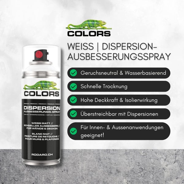 Das COLORS Dispersion Ausbesserungsspray ist ein hochdeckender, wasserbasierter Speziallack zur schnellen und effektiven Abdeckung von Verschmutzungen. Ideal geeignet für Wände, Decken und viele weitere Untergründe im Innen- und Außenbereich. Perfekt zum Isolieren von Flecken wie Fett, Nikotin, Russ, Wasser, Kaffee, Bitumen, Teer, Insekten- oder Farbstiftspuren.
