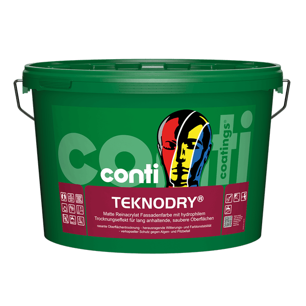 Conti® TeknoDry Reinacrylat-Fassadenfarbe – matte Fassadenfarbe mit hydrophiler Oberfläche, schneller Trocknung & Algenschutz. Für WDVS & Putzfassaden geeignet.