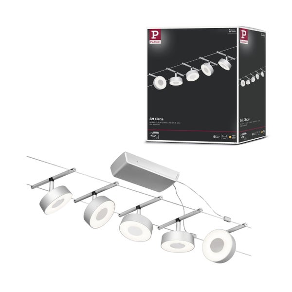 Die Serie Circle in Chrom matt mit 5 LED-Spots kann sowohl an der Wand als auch an der Decke montiert werden und bietet dadurch grenzenlose Gestaltungsmöglichkeiten. Egal ob gerade, schräg oder verwinkelt - Seilsysteme passen in jeden Raum und sind die Problemlöser für schwierige Installationsbedingungen. Das Basisset lässt sich individuell durch Einzelspots, Umlenker und weiteres Zubehör ergänzen. Das Seil mit einer Länge vom 10 m, kann in der Mitte geteilt werden, sodass das System auf max. 5 m gespannt werden kann. Mit diesem System lässt sich eine optimale Lichtverteilung realisieren, bei steigendem Lichtbedarf lässt es sich problemlos erweitern. Für die Verteilung der Leuchten im gesamten Raum wird nur ein Stromauslass benötigt. Systeme mit der Technik 12V DC (Gleichspannung) lassen sich nicht über einen Wand-Einbaudimmer dimmen.