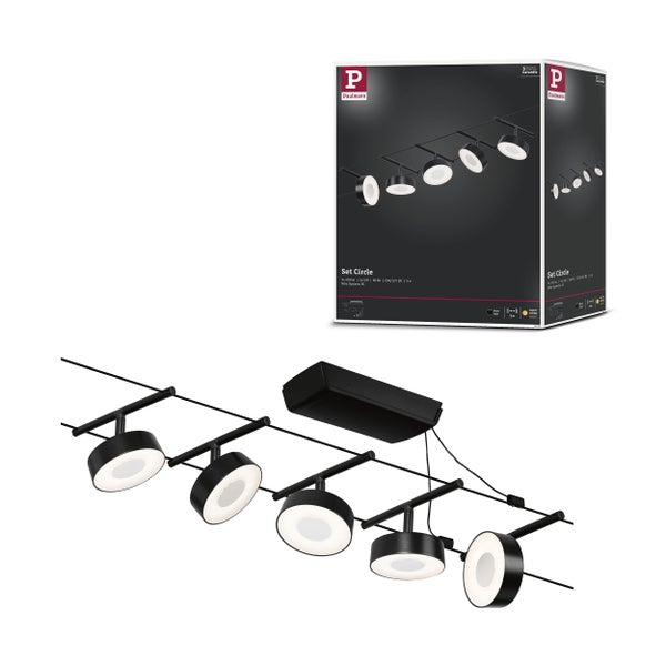 Die Serie Circle in Schwarz matt mit 5 LED-Spots kann sowohl an der Wand als auch an der Decke montiert werden und bietet dadurch grenzenlose Gestaltungsmöglichkeiten. Egal ob gerade, schräg oder verwinkelt - Seilsysteme passen in jeden Raum und sind die Problemlöser für schwierige Installationsbedingungen. Das Basisset lässt sich individuell durch Einzelspots, Umlenker und weiteres Zubehör ergänzen. Das Seil mit einer Länge vom 10 m, kann in der Mitte geteilt werden, sodass das System auf max. 5 m gespannt werden kann. Mit diesem System lässt sich eine optimale Lichtverteilung realisieren, bei steigendem Lichtbedarf lässt es sich problemlos erweitern. Für die Verteilung der Leuchten im gesamten Raum wird nur ein Stromauslass benötigt. Systeme mit der Technik 12V DC (Gleichspannung) lassen sich nicht über einen Wand-Einbaudimmer dimmen.