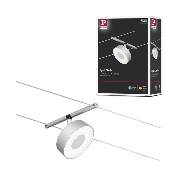 Der Einzelspot Circle in Chrom matt eignet sich besonders zur Ergänzung eines bestehenden Seilsystems. Das System kann sowohl an der Wand als auch an der Decke montiert werden und bietet dadurch grenzenlose Gestaltungsmöglichkeiten. Egal ob gerade, schräg oder verwinkelt - Seilsysteme passen in jeden Raum und sind die Problemlöser für schwierige Installationsbedingungen. Mit diesem System lässt sich eine optimale Lichtverteilung realisieren, bei steigendem Lichtbedarf lässt es sich problemlos erweitern. Für die Verteilung der Leuchten im gesamten Raum wird nur ein Stromauslass benötigt. Systeme mit der Technik 12V DC (Gleichspannung) lassen sich nicht über einen Wand-Einbaudimmer dimmen.