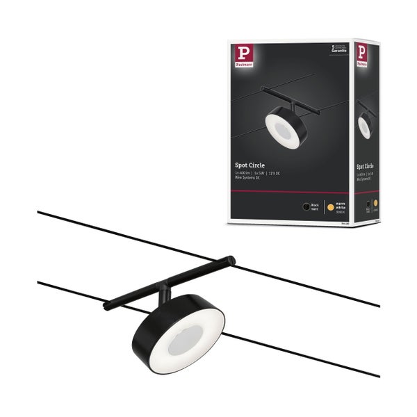 Der Einzelspot Circle in Schwarz matt eignet sich besonders zur Ergänzung eines bestehenden Seilsystems. Das System kann sowohl an der Wand als auch an der Decke montiert werden und bietet dadurch grenzenlose Gestaltungsmöglichkeiten. Egal ob gerade, schräg oder verwinkelt - Seilsysteme passen in jeden Raum und sind die Problemlöser für schwierige Installationsbedingungen. Mit diesem System lässt sich eine optimale Lichtverteilung realisieren, bei steigendem Lichtbedarf lässt es sich problemlos erweitern. Für die Verteilung der Leuchten im gesamten Raum wird nur ein Stromauslass benötigt. Systeme mit der Technik 12V DC (Gleichspannung) lassen sich nicht über einen Wand-Einbaudimmer dimmen.