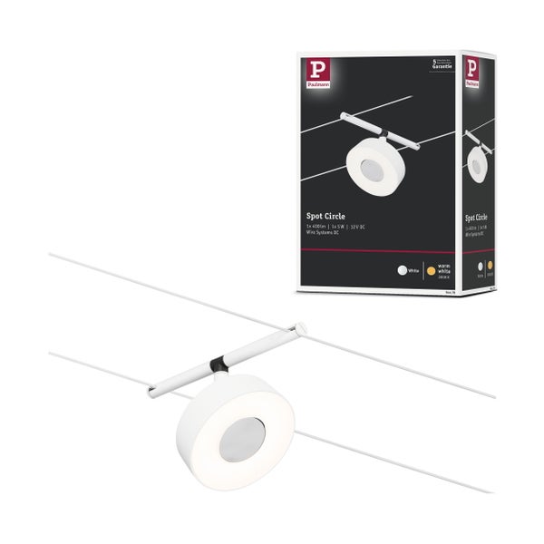 Der Einzelspot Circle in Weiß matt eignet sich besonders zur Ergänzung eines bestehenden Seilsystems. Das System kann sowohl an der Wand als auch an der Decke montiert werden und bietet dadurch grenzenlose Gestaltungsmöglichkeiten. Egal ob gerade, schräg oder verwinkelt - Seilsysteme passen in jeden Raum und sind die Problemlöser für schwierige Installationsbedingungen. Mit diesem System lässt sich eine optimale Lichtverteilung realisieren, bei steigendem Lichtbedarf lässt es sich problemlos erweitern. Für die Verteilung der Leuchten im gesamten Raum wird nur ein Stromauslass benötigt. Systeme mit der Technik 12V DC (Gleichspannung) lassen sich nicht über einen Wand-Einbaudimmer dimmen.