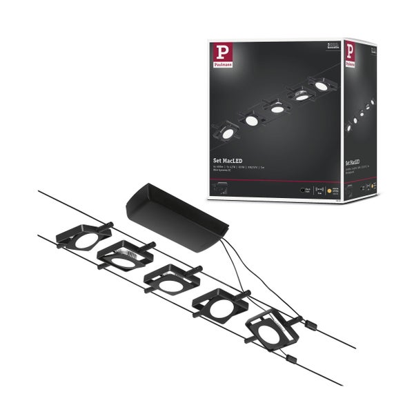 Die Serie MacLED in Schwarz matt#Chrom mit 5 LED-Spots kann sowohl an der Wand als auch an der Decke montiert werden und bietet dadurch grenzenlose Gestaltungsmöglichkeiten. Egal ob gerade, schräg oder verwinkelt - Seilsysteme passen in jeden Raum und sind die Problemlöser für schwierige Installationsbedingungen. Das Basisset lässt sich individuell durch Einzelspots, Umlenker und weiteres Zubehör ergänzen. Das Seil mit einer Länge vom 10 m, kann in der Mitte geteilt werden, sodass das System auf max. 5 m gespannt werden kann. Mit diesem System lässt sich eine optimale Lichtverteilung realisieren, bei steigendem Lichtbedarf lässt es sich problemlos erweitern. Für die Verteilung der Leuchten im gesamten Raum wird nur ein Stromauslass benötigt. Systeme mit der Technik 12V DC (Gleichspannung) lassen sich nicht über einen Wand-Einbaudimmer dimmen.