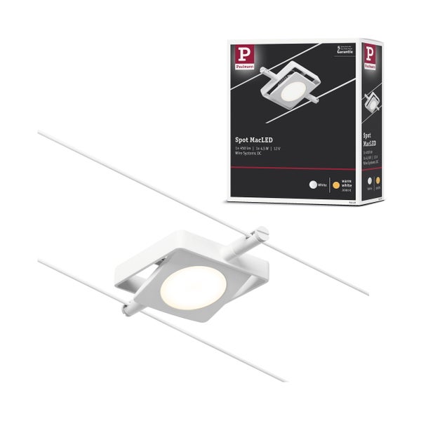 Der Einzelspot MacLED in Weiß matt, Chrom eignet sich besonders zur Ergänzung eines bestehenden Seilsystems. Das System kann sowohl an der Wand als auch an der Decke montiert werden und bietet dadurch grenzenlose Gestaltungsmöglichkeiten. Egal ob gerade, schräg oder verwinkelt - Seilsysteme passen in jeden Raum und sind die Problemlöser für schwierige Installationsbedingungen. Mit diesem System lässt sich eine optimale Lichtverteilung realisieren, bei steigendem Lichtbedarf lässt es sich problemlos erweitern. Für die Verteilung der Leuchten im gesamten Raum wird nur ein Stromauslass benötigt. Systeme mit der Technik 12V DC (Gleichspannung) lassen sich nicht über einen Wand-Einbaudimmer dimmen.
