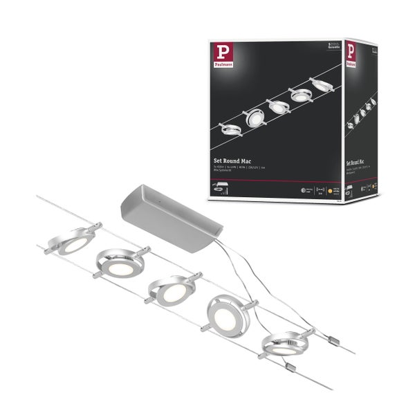 Die Serie RoundMac in Chrom matt#Chrom kann sowohl an der Wand als auch an der Decke montiert werden und bietet dadurch grenzenlose Gestaltungsmöglichkeiten. Egal ob gerade, schräg oder verwinkelt - Seilsysteme passen in jeden Raum und sind die Problemlöser für schwierige Installationsbedingungen. Das Basisset lässt sich individuell durch Einzelspots, Umlenker und weiteres Zubehör ergänzen. Das Seil mit einer Länge vom 10 m, kann in der Mitte geteilt werden, sodass das System auf max. 5 m gespannt werden kann. Mit diesem System lässt sich eine optimale Lichtverteilung realisieren, bei steigendem Lichtbedarf lässt es sich problemlos erweitern. Für die Verteilung der Leuchten im gesamten Raum wird nur ein Stromauslass benötigt. Systeme mit der Technik 12V DC (Gleichspannung) lassen sich nicht über einen Wand-Einbaudimmer dimmen.