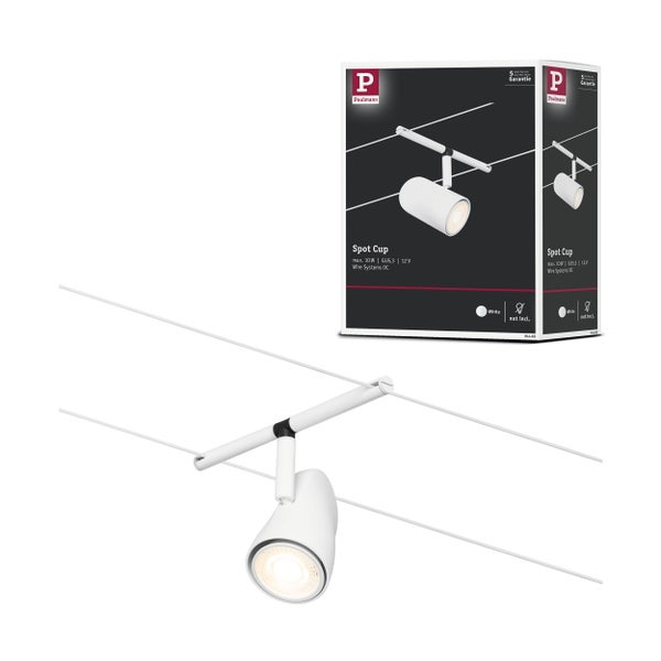 Der Einzelspot Cup in Weiß matt, Chrom eignet sich besonders zur Ergänzung eines bestehenden Seilsystems. Das System kann sowohl an der Wand als auch an der Decke montiert werden und bietet dadurch grenzenlose Gestaltungsmöglichkeiten. Egal ob gerade, schräg oder verwinkelt - Seilsysteme passen in jeden Raum und sind die Problemlöser für schwierige Installationsbedingungen. Mit diesem System lässt sich eine optimale Lichtverteilung realisieren, bei steigendem Lichtbedarf lässt es sich problemlos erweitern. Für die Verteilung der Leuchten im gesamten Raum wird nur ein Stromauslass benötigt. Systeme mit der Technik 12V DC (Gleichspannung) lassen sich nicht über einen Wand-Einbaudimmer dimmen.