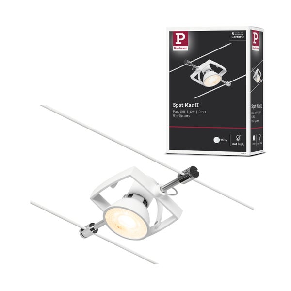 Der Einzelspot Mac II in Weiß matt, Chrom eignet sich besonders zur Ergänzung eines bestehenden Seilsystems. Das System kann sowohl an der Wand als auch an der Decke montiert werden und bietet dadurch grenzenlose Gestaltungsmöglichkeiten. Egal ob gerade, schräg oder verwinkelt - Seilsysteme passen in jeden Raum und sind die Problemlöser für schwierige Installationsbedingungen. Mit diesem System lässt sich eine optimale Lichtverteilung realisieren, bei steigendem Lichtbedarf lässt es sich problemlos erweitern. Für die Verteilung der Leuchten im gesamten Raum wird nur ein Stromauslass benötigt. Systeme mit der Technik 12V DC (Gleichspannung) lassen sich nicht über einen Wand-Einbaudimmer dimmen.