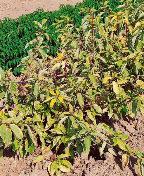 Cornus alba ‘Gouchaultii’, der Tatarische Hartriegel, ist ein markanter Blüten- und Zierstrauch, der mit seiner leuchtenden Blattzeichnung und farbigen Rinde jede Pflanzung bereichert. Das sommergrüne Laub zeigt eine dekorative Gelbgrün-Panaschierung mit frischem, oft rosigem Austrieb, im Herbst folgen warme Gelb- bis Orangetöne. Von Mai bis Juni erscheinen zarte, cremeweiße Trugdolden, aus denen sich elfenbeinweiße bis bläuliche Früchte entwickeln. Besonders eindrucksvoll sind die leuchtend roten Triebe im Winter, die dem Garten Struktur und Farbe geben. Der dichtbuschige, aufrecht wachsende Gartenstrauch erreicht mittlere bis größere Höhen und eignet sich gleichermaßen als Solitär, in Gruppenpflanzung, als Heckenpflanze für lockere Sichtschutzhecken oder als attraktive Kübelpflanze auf Terrasse und im Vorgarten. ‘Gouchaultii’ bevorzugt sonnige bis halbschattige Standorte; je mehr Sonne, desto intensiver leuchten Blattpanaschierung und Rindenfarbe. Der Boden sollte frisch, humos und durchlässig sein, von schwach sauer bis neutral, mit gleichmäßiger Feuchte und ohne Staunässe, auch zeitweilige Nässe wird gut toleriert. Pflegeleicht und schnittverträglich lässt sich der Blütenstrauch im Spätwinter auslichten oder verjüngen; ein kräftiger Rückschnitt fördert junge, besonders farbige Triebe. Eine Frühjahrsgabe organischer Nährstoffe und eine Mulchschicht unterstützen Vitalität und Blattglanz. Als vielseitiger Gartenstrauch verbindet Cornus alba ‘Gouchaultii’ ganzjährig Struktur, Blattdekor und Saisonhöhepunkte und setzt sowohl im Beet als auch am Gehölzrand starke Akzente.