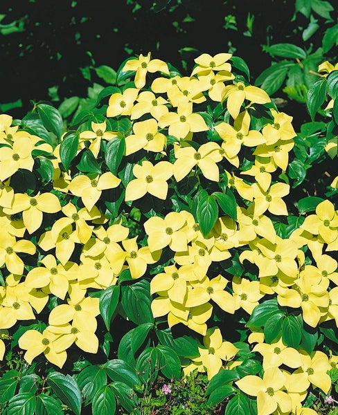 Cornus kousa chinensis ‘China Girl’, der Chinesische Blumen-Hartriegel, ist ein edles Ziergehölz für Anspruchsvolle und begeistert als Blütenstrauch mit außergewöhnlicher Eleganz. Im späten Frühjahr bis in den Frühsommer, meist im Mai und Juni, schmückt er sich mit großen, cremeweißen Hochblättern, die den unscheinbaren Blüten einen eindrucksvollen Rahmen geben und je nach Witterung zart rosig überhaucht nachfärben. Das sommergrüne Laub zeigt sich tiefgrün, elliptisch und sauber gezeichnet, bevor es im Herbst in warmen Orange- bis Scharlachtönen leuchtet und den Gartenstrauch zu einem Saisonhöhepunkt macht. Der Wuchs ist zunächst aufrecht und elegant konisch, später breit ausladend, mehrstämmig und gut verzweigt, wodurch sich der Blumen-Hartriegel hervorragend als Solitärgehölz im Rasen, im Vorgarten oder als Blickfang am Terrassenrand einsetzen lässt. In Rabatten und Beeten harmoniert er mit Schattenstauden, Rhododendren und anderen Waldgarten-Partnern; in großen Gefäßen ist er als hochwertige Kübelpflanze auf geschützten Standorten denkbar. Ein sonniger bis halbschattiger Platz mit gleichmäßig frischer, gut durchlässiger, humoser und eher schwach saurer bis neutrale Erde fördert Blütenfülle und gesundes Wachstum. Staunässe und stark kalkhaltige Böden werden gemieden; eine Mulchschicht hält die Wurzeln kühl und die Feuchtigkeit konstant. Schnittmaßnahmen sind kaum nötig und beschränken sich bei Bedarf auf sanftes Auslichten nach der Blüte. Mit seiner harmonischen Wuchsform, der üppigen Blütenpracht und der intensiven Herbstfärbung ist ‘China Girl’ ein langlebiger Blütenstrauch von hohem Zierwert für Garten, Beet und hochwertige Gruppenpflanzungen.