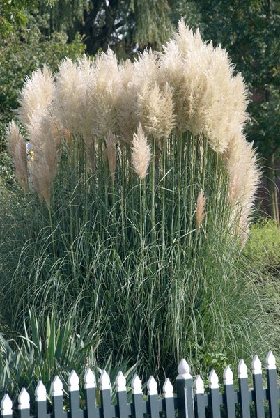 Cortaderia selloana 'Sunningdale Silver', das stattliche Pampasgras, ist ein ausdrucksstarkes Ziergras, das mit eleganten, silbrig-weißen Blütenrispen von Spätsommer bis in den Herbst beeindruckt. Als robuste Gartenstaude mit botanischer Präsenz bildet es dichte, horstige Büsche mit straff aufrechtem Wuchs und bogig überhängendem, blaugrünem Laub, dessen schmale Blätter eine feine Struktur zeichnen. Die auffälligen Rispen stehen über dem Laub wie Federn, fangen das Licht und setzen in Beet und Rabatte glänzende Akzente, die auch im Winter als strukturgebende Silhouetten wirken. Ideal als Solitärpflanze zur Betonung moderner Architekturgärten, im Präriebeet, in der Hintergrundbepflanzung oder in Gruppenpflanzung für eindrucksvolle, hohe Gartenbilder; ebenso macht es in großen Kübeln auf Terrasse und im Vorgarten als dekorative Kübelpflanze eine beeindruckende Figur. Ein vollsonniger, warmer und möglichst windgeschützter Standort fördert üppige Blüten, der Boden sollte gut durchlässig, eher sandig-lehmig und nährstoffreich sein, Staunässe wird nicht vertragen. Nach der Etablierung erweist sich das Pampasgras als erstaunlich trockenheitsverträglich und dankbar für eine sparsame Frühjahrsdüngung. Die alten Halme und Rispen belässt man über den Winter stehen und schneidet sie erst im zeitigen Frühjahr kräftig zurück; in rauen Lagen schützt ein zusammengebundenes Laubbüschel das Herz vor Nässe. 'Sunningdale Silver' ist eine langlebige Strukturpflanze und ein klassischer Blüten- und Gartenstrauch-Ersatz für luftige Sichtschutzlösungen, der jedem Pflanzenarrangement Höhe, Textur und Leichtigkeit verleiht.