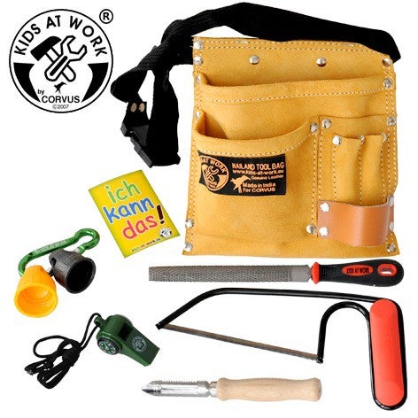 Bestückter Werkzeuggürtel 6-teilig. Inhalt: Flaschenkappen, Trillerpfeife mit Kompass und Thermometer, Handsäge, Raspel halbrund und Schnitz-Schäler. Gürtel echt Leder!