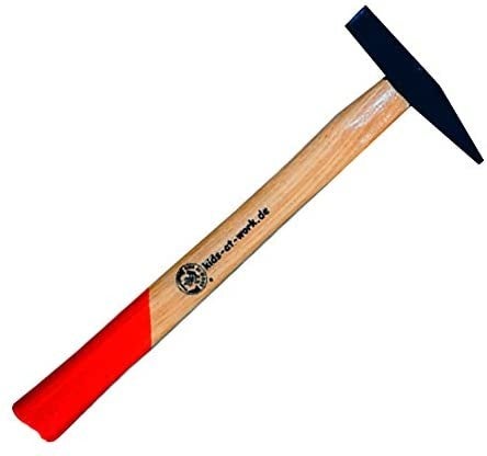 Ein handlicher 100-Gramm Hammer, etwas kürzer als normal (Länge ca. 21 cm). Mit einem Stiel aus echtem Hickoryholz liegt er prima in der Hand. Wie heißt es doch oft so schön bei so manchen Nonsens-Spielzeug: ''trains hand-eye coordination!''. Nun, hier stimmt's, denn man lernt schnell sich nicht auf den Daumen zu hauen!