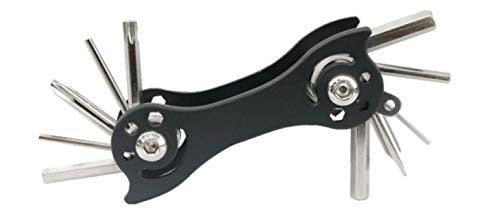 Ein stabiles Fahrrad Werkzeug in dieser handlichen Größe sollte man immer dabei haben, wenn man mit dem Velo unterwegs ist. Sechskantschlüssel in 6 verschiedenen Stärken, Schraubenzieher PH2, Schraubenzieher Schlitz, Innensechsrundschlüssel und ein Schlüsselring bilden die Multifunktion dieses Werkzeuges. Lieferung mit praktischer Gürteltasche.