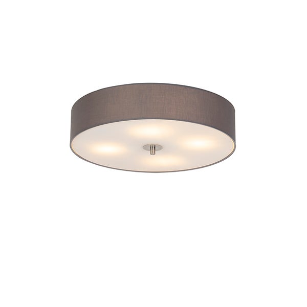 Eine zeitlose runde Deckenleuchte mit einem Lampenschirm in einem wunderschönen Dunkelgrau. Der für den Lampenschirm verwendete Stoff besteht aus Baumwolle. Die Deckenleuchte Drum ist an der Unterseite mit einer matten Glasplatte versehen, die für einen ruhigen Lichteffekt im Zuhause sorgt. Die Leuchte hat einen Durchmesser von 50 cm und eine Höhe von 13 cm. Die Leuchte ist mit einem externen Dimmer dimmbar (Dimmer nicht im Lieferumfang enthalten). Du kannst deine Drum mit vier Glühbirnen mit einer E27-Fassung (je max. 40 W) ergänzen. Eine angenehme Deckenleuchte für jeden Raum im Haus!