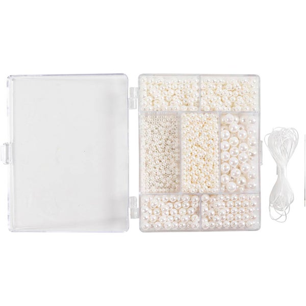 Mit diesem Mix können Sie ganz einfach Ihren eigenen individuellen Perlenschmuck mit perlmuttweißen Perlen gestalten. Er enthält alle Materialien und Anleitungen, die Sie benötigen. Wenn Sie gern Ihren eigenen Perlenschmuck basteln, ist unser Kreativ Mix Schmuck perfekt für Sie. Er enthält über 850 perlmuttweiße Perlen, die Sie nach Lust und Laune kombinieren können. Die Perlen haben verschiedene Größen von klein und zart bis groß und klassisch für unendliche Gestaltungsmöglichkeiten. Fädeln Sie die Perlen einfach auf das Schmuckgummiband, um ganz persönliche Halsketten und Armbänder zu gestalten.