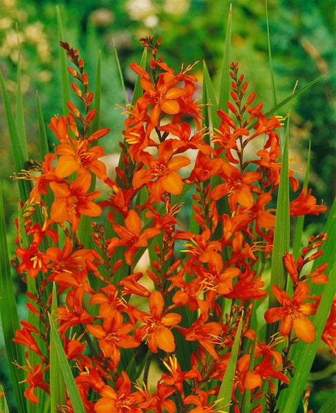 Crocosmia masoniorum, die Montbretie, bringt mit ihren leuchtenden, trichterförmigen Blüten in sattem Orange bis Rotorange sommerliche Strahlkraft in jedes Staudenbeet. Die elegante Blütenstaude entwickelt aufrechte, später sanft überhängende Blütenrispen, die von Juli bis September zuverlässig Farbe liefern und zugleich eine ausgezeichnete Schnittblume für die Vase sind. Schlanke, schwertförmige, frischgrüne Blätter stehen in fächerartigen Horsten und setzen eine klare, architektonische Struktur, die sich hervorragend mit Gräsern und anderen Sommerblühern kombinieren lässt. Als Zierstaude eignet sich Crocosmia masoniorum für Rabatten, den Vorgarten und prärieartige Pflanzungen ebenso wie als Solitärakzent oder in lockeren Gruppenpflanzungen; auch im großen Kübel auf Terrasse und Balkon kommt der dynamische Wuchs besonders gut zur Geltung. Ein sonniger bis halbschattiger Standort fördert die reichliche Blüte, während ein humoser, durchlässiger, gleichmäßig frischer Boden Staunässe vermeidet und für vitalen Wuchs sorgt. In der Pflege zeigt sich die Montbretie unkompliziert: Ein moderater Nährstoffschub im Frühjahr, regelmäßiges Gießen in Trockenphasen sowie das Entfernen verblühter Rispen unterstützen eine lange Blütezeit. Die horstbildende Gartenstaude wächst kräftig, bleibt aber formtreu und kann alle paar Jahre geteilt werden, um die Vitalität zu erhalten. In rauen Lagen empfiehlt sich eine leichte Abdeckung der Rhizome im Winter, während Kübelpflanzen etwas geschützter stehen sollten. Crocosmia masoniorum setzt mit ihrem prägnanten Habitus und den feurigen Blüten starke Akzente und bereichert jedes Beet als ausdrucksstarker Sommerblüher.