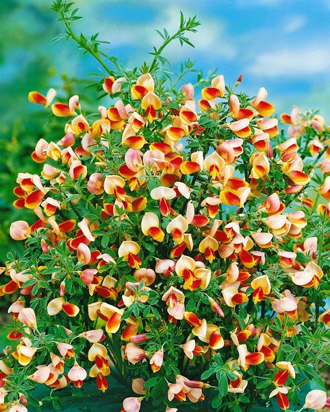 Cytisus scoparius ‘Dragonfly’, der Besenginster, ist ein ausdrucksstarker Blütenstrauch, der mit seinen zweifarbigen, elegant gezeichneten Blüten sofort ins Auge fällt. Im späten Frühling bis in den Frühsommer öffnet dieser Zierstrauch eine Fülle an Schmetterlingsblüten in warmen Gelb- und Rubin- bis Kupfertönen, die dicht an den grünen, feinen Trieben sitzen und dem Gartenstrauch eine leuchtende, beinahe schwebende Anmutung verleihen. Das Laub ist klein, sommergrün und tritt gegenüber den photosynthetisch aktiven, schlanken Trieben dezent zurück. ‘Dragonfly’ wächst aufrecht, locker-buschig mit leicht überhängenden Zweigen und erreicht je nach Standort mittlere Höhe und Breite, wodurch er sich gleichermaßen als Solitär im Vorgarten, als strukturgebender Partner in der Gruppenpflanzung oder als lockere Blütenhecke anbietet. In Kombination mit Heidepflanzen, Gräsern oder im Steingarten setzt der Besenginster markante Farbakzente, eignet sich aber ebenso als Kübelpflanze auf sonnigen Terrassen und Balkonen, wo sein kompakter Wuchs und die reiche Blüte ideal zur Geltung kommen. Bevorzugt wird ein vollsonniger, warmer Standort mit durchlässigem, eher magerem, sandig-humosem Boden; Staunässe sollte konsequent vermieden werden. Nach der Blüte empfiehlt sich ein leichter Rückschnitt der jungen Triebe, um den Blütenstrauch dauerhaft kompakt und blühfreudig zu halten. Insgesamt ist Cytisus scoparius ‘Dragonfly’ eine pflegeleichte, charismatische Wahl für Beet und Rabatte, die mit intensiver Farbwirkung, natürlicher Eleganz und vielseitiger Verwendbarkeit überzeugt.