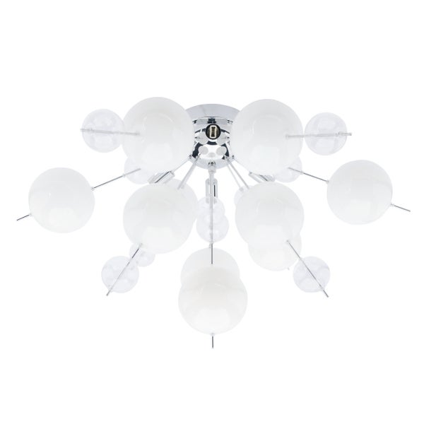 Die Deckenleuchte unserer Kollektion EXPLOSION - Ein Highlight für Ihr Zuhause Deckenleuchten eignen sich vorzüglich, um einen Raum gleichmäßig zu beleuchten. Sie bieten eine weite Lichtverteilung, die jede Ecke erreicht, und schaffen somit eine helle und einladende Atmosphäre. Mit der halbrunden Gestalt und dem extravaganten Design ist dieser Artikel im Modern Style ein echter Blickfang für alle, die es elegant mögen. Die Leuchte aus Metall und Glas in weiß ist ein Blickfang in jedem Raum.. Das verchromte Gestell und der klar-transparente Schirm bilden eine perfekte Einheit. Die Deckenleuchte misst 57 cm in der Länge, 57 cm in der Breite/Tiefe und 38 cm in der Höhe. Somit hat die Leuchte einen Durchmesser von 57 cm. Mit der Deckenleuchte, ausgestattet mit 6 mal G9, von Ihnen mit entsprechenden Leuchtmitteln nach Ihren Wünschen zu bestücken, bringen Sie Licht in jeden Raum. Durch die Möglichkeit, das Leuchtmittel selbst zu wechseln, sind Sie nicht nur flexibel, sondern sparen auch bares Geld. Diese Leuchte entspricht der Klasse 2. Für den Netzbetrieb dieses Geräts wird eine Netzspannung von 220-240V ~ 50Hz benötigt. Eine Gesamtleistung von 168 Watt sorgt für ein helles und energieeffizientes Leuchten im Wohnbereich. Mit unserer Deckenleuchte verleihen Sie Ihrem Zuhause das optimale Lichtambiente und sorgen für ein attraktives Ambiente.