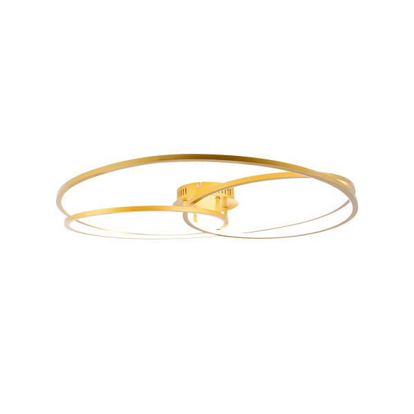 Mit unserer Rowin holst du dir eine wunderschöne Deckenleuchte nach Hause. Diese Designerlampe ist aus Kunststoff, Aluminium und Stahl gefertigt und in Goldfarbe gehalten. Das Design dieser Leuchte erzeugt einen stimmungsvollen Lichteffekt im Raum. Sie hat einen Durchmesser von 78,5 cm und eine Höhe von 13 cm. Die Montageplatte hat einen Durchmesser von 16 cm und eine Höhe von 4 cm. Das LED-Leuchtmittel ist bereits in der Leuchte integriert und hat eine Lebensdauer von 30.000 Brennstunden. Mit dem integrierten Dimmer kannst du es dir zu Hause so richtig gemütlich machen, denn diese Leuchte ist dimmbar. Mit dieser Rowin Deckenleuchte holst du dir einen echten Hingucker ins Haus.