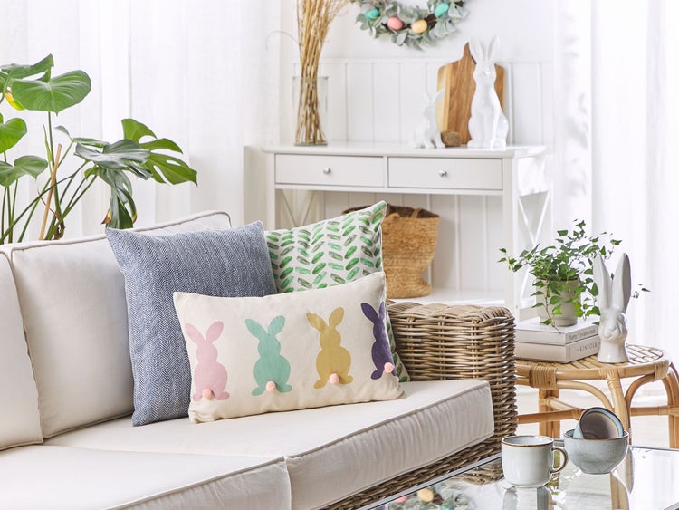 Zwei rechteckige, flauschige Sofakissen mit niedlichen Hasenmotiven. Wer die Gemütlichkeit seiner Räume steigern möchte, ist mit diesem zauberhaften Kissen-Set gut beraten. Die Vorderseiten der Kissenhüllen sind mit einem niedlichen Hasen-Druckmotiv versehen, wobei die Häschen mit flauschigen Bommel-Schwänzen ergänzt sind. Im Innern der weichen Kissenbezüge verbergen sich kuschelige Polyester-Füllungen. Die unterschiedlichen Pastelltöne und das Tiermotiv erlauben Ihnen, die Kissen nicht nur als Dekoelement im Kinderzimmer, sondern auch als Osterdeko in Ihren Wohnbereichen zu nutzen. Die Rückseiten der Sofakissen sind einfarbig gehalten. Dank der versteckten Reißverschlüsse lassen sich die Hüllen einfach bei Bedarf abnehmen. Details: Typ Dekokissen. Farbe: Beige. Material: Stoff. Material: Baumwolle. Füllmaterial: Polyester. Zusammenstellung: 50 % Baumwolle. Form: Rechteckig. Handgefertigt: Nein. Muster: Tiermuster. Abmessungen: Tiefe: 50 cm. Breite: 30 cm. Höhe: 10 cm. Füllgewicht: 0.4 kg. Gewicht: 0.6 kg. .Sie kaufen: 2 x Zierkissen. Produktvorteile: Herrlich weich, Wunderbar geeignet für Schlaf- und Wohnbereich, Gemütliche Ausstrahlung, Dekorativ und zugleich funktional, Auffälliges, dekoratives Muster, Abnehmbare Bezüge. Montage: Benötigt keine Montage. Zusatzinformationen: Das Kissen ist vakuumverpackt. Nehmen Sie Ihr Kissen aus der Verpackung heraus und lassen Sie es 24 Stunden lang liegen, bis es seine volle Dichte erreicht. Pflegeanleitung: Stoff: 1.Nur von Hand, mit kaltem Wasser und milden Reinigungsmitteln waschen. 2.Bitte nicht im Trockner trocknen und auch nicht bügeln.