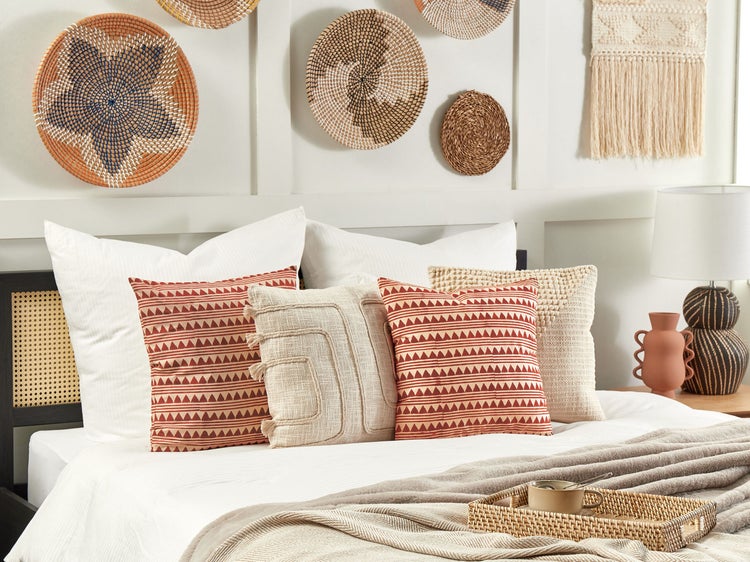 Handgefertigte Dekokissen mit geometrischen Mustern. Dieses dekorative Kissen-Set bringt frischen Wind in Ihr Zuhause und verleiht Ihrem Interieur einen charmanten Look. Die handgefertigten Baumwollbezüge mit geometrischem Muster im Blockdruck sind mit Reißverschlüssen versehen, die die Reinigung erleichtern. Dank der weichen Polyesterfüllungen eignet sich das Kissenset nicht nur als dekorativer Akzent, sondern auch für ein gemütliches Nickerchen. Details: Typ Dekokissen. Farbe: Rot. Material: Stoff. Material: Baumwolle. Füllmaterial: Polyester. Zusammenstellung: 100% Baumwolle. Form: Quadratisch. Handgefertigt: Ja. Muster: ZickZack-Muster. Abmessungen: Tiefe: 45 cm. Breite: 45 cm. Höhe: 10 cm. Füllgewicht: 0.6 kg. Gewicht: 0.7 kg. .Sie kaufen: 2 x Zierkissen. Produktvorteile: Handgefertigtes Blockdruckmuster, Wunderbar geeignet für Schlaf- und Wohnbereich, Wunderschöne, leuchtende Farben, Qualitativ hochwertiges Material, Abnehmbare Bezüge. Montage: Benötigt keine Montage. Zusatzinformationen: Das Kissen ist vakuumverpackt. Nehmen Sie Ihr Kissen aus der Verpackung heraus und lassen Sie es 24 Stunden lang liegen, bis es seine volle Dichte erreicht. Jeder Artikel ist ein handgefertigtes Unikat; Farbschattierung und Muster können daher vom Foto abweichen. Pflegeanleitung: Baumwolle: 1.Von Hand oder mit einem Feinwäsche-Programm bei max. 30°C waschen, wenn auf dem Etikett keine weiteren Hinweise des Herstellers gegeben sind. 2.Wenn auf dem Etikett nicht anders angegeben, bitte nicht im Trockner trocknen und auch nicht bügeln.