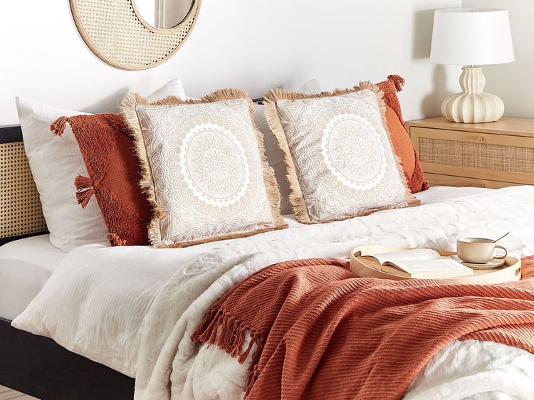 Boho-Kissen mit orientalischem Muster. Dieses Kissen-Set verbindet ein schönes orientalisches Muster mit dem Boho-Stil. Die Dekokissen haben eine klassische quadratische Form mit dekorativen Quasten an den Seiten und werden durch ihren auffälligen Look definitiv zum Eyecatcher im Wohnraum. Die beigen und weißen Farbeen passen zudem gut zu verschiedenen Einrichtungsstilen. Dank der verwendeten Materialien und der dicken Füllung sind die Kissen weich und bequem. Dekorieren Sie Ihr Bett oder Sofa mit diesen stilvollen Wohnaccessoires. Details: Typ Dekokissen. Farbe: Beige. Farbton: Sandbeige. Material: Kunststoff. Material: Polyester. Füllmaterial: Polyester. Zusammenstellung: 100% Polyester. Form: Quadratisch. Handgefertigt: Nein. Muster: Orientalisches Muster. Abmessungen: Tiefe: 45 cm. Breite: 45 cm. Höhe: 7 cm. Füllgewicht: 0.4 kg. Gewicht: 0.5 kg. .Sie kaufen: 2 x Zierkissen. Produktvorteile: Wunderbar geeignet für Schlaf- und Wohnbereich, Retro Stil, Leichtes und zugleich strapazierfähiges Material, Nur für Innenräume geeignet, Abnehmbare Bezüge. Montage: Benötigt keine Montage. Zusatzinformationen: Das Kissen ist vakuumverpackt. Nehmen Sie Ihr Kissen aus der Verpackung heraus und lassen Sie es 24 Stunden lang liegen, bis es seine volle Dichte erreicht. Pflegeanleitung: Stoff: 1.Nur von Hand, mit kaltem Wasser und milden Reinigungsmitteln waschen. 2.Bitte nicht im Trockner trocknen und auch nicht bügeln.