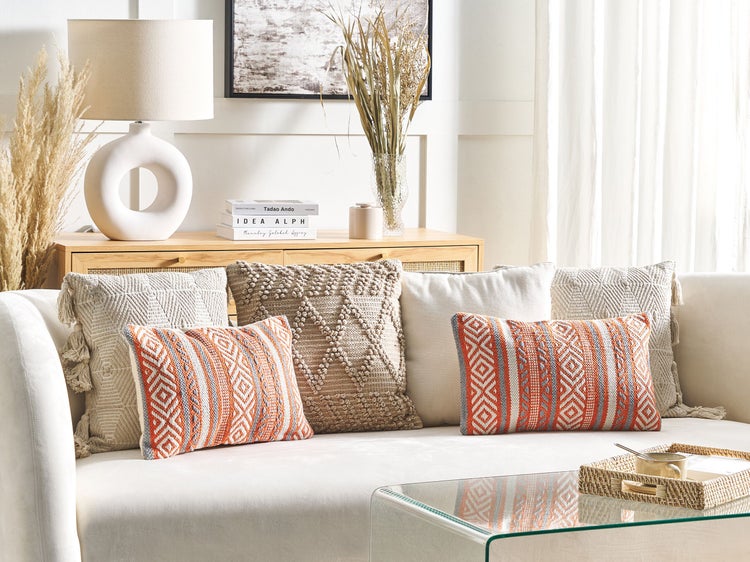 Dekokissen mit mehrfarbigem Muster im Boho Stil. Farbenfrohe Wohnaccessoires mit geometrischen Mustern eignen sich nicht nur für Boho Einrichtungen, sondern auch für zahlreiche Stilrichtungen. Dieses Kissen mit seinen warmen Farben fügt sich mühelos in moderne und traditionelle Bereiche ein. Dank der weichen Baumwollbezüge sind die Kissen bequem zu benutzen und leicht zu pflegen. Zusammen mit hellen Accessoires und Möbeln ergibt sich ein angenehmer, harmonischer Effekt für das Auge. Details: Typ Dekokissen. Farbe: Orange. Material: Stoff. Material: Baumwolle. Füllmaterial: Polyester. Zusammenstellung: 100% Baumwolle. Form: Rechteckig. Handgefertigt: Ja. Muster: Geometrisches Muster. Abmessungen: Tiefe: 30 cm. Breite: 50 cm. Höhe: 10 cm. Füllgewicht: 0.35 kg. Gewicht: 0.7 kg. .Sie kaufen: 2 x Zierkissen. Produktvorteile: Dekorativ und zugleich funktional, Wunderbar geeignet für Schlaf- und Wohnbereich, Wunderschöne, leuchtende Farben, Retro Stil, Pflegeleichtes und strapazierfähiges Material, Handgefertigte Präzision. Montage: Benötigt keine Montage. Zusatzinformationen: Das Kissen ist vakuumverpackt. Nehmen Sie Ihr Kissen aus der Verpackung heraus und lassen Sie es 24 Stunden lang liegen, bis es seine volle Dichte erreicht. Pflegeanleitung: Baumwolle: 1.Von Hand oder mit einem Feinwäsche-Programm bei max. 30°C waschen, wenn auf dem Etikett keine weiteren Hinweise des Herstellers gegeben sind. 2.Wenn auf dem Etikett nicht anders angegeben, bitte nicht im Trockner trocknen und auch nicht bügeln.