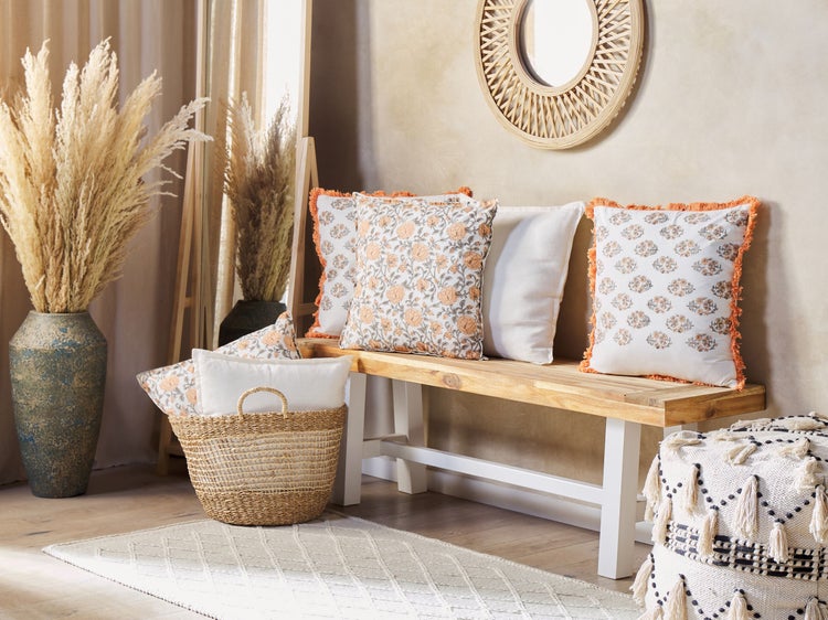 Quadratisches, cremeweißes Zierkissen 2er Set aus hochwertiger Baumwolle mit Blumenmotiv. Das Kissen Set zeichnet sich durch ein einzigartiges, florales Muster aus, das von Hand per Blockdruck hergestellt wurde. Die wunderschöne Farbkombination aus klassischem Cremeweiß mit dezentem Orange und Grau wird in jede Einrichtung frischen Wind einziehen lassen. Die weichen Kissenbezüge bestehen aus hochwertiger Baumwolle und sind mit dicken Füllungen versehen, so dass Sie die Sofakissen nicht nur für dekorative Zwecke, sondern auch zum Entspannen perfekt nutzen können. Die versteckten Reißverschlüsse garantieren die Pflegeleichtigkeit der Kissenhüllen. Details: Typ Dekokissen. Stil: Boho. Farbe: Bunt. Farbton: Cremeweiß. Material: Stoff. Material: Baumwolle. Füllmaterial: Polyester. Zusammenstellung: 100% Baumwolle. Form: Quadratisch. Handgefertigt: Ja. Muster: Blumenmuster. Abmessungen: Tiefe: 45 cm. Breite: 45 cm. Höhe: 10 cm. Füllgewicht: 0.5 kg. Gewicht: 0.6 kg. .Sie kaufen: 2 x Zierkissen. Produktvorteile: Handgefertigtes Blockdruckmuster, Wunderbar geeignet für Schlaf- und Wohnbereich, Wunderschöne, leuchtende Farben, Dekorativ und zugleich funktional, Hohe Qualität, Kissenbezüge mit versteckten Nähten und Reissverschlüssen. Montage: Benötigt keine Montage. Zusatzinformationen: Das Kissen ist vakuumverpackt. Nehmen Sie Ihr Kissen aus der Verpackung heraus und lassen Sie es 24 Stunden lang liegen, bis es seine volle Dichte erreicht. Bitte beachten Sie, dass jedes Produkt handgefertigt ist. Abweichungen in Struktur, Farbe oder Form können aufgrund der Eigenschaften der verwendeten Materialien auftreten und stellen keinen Qualitätsmangel dar. Pflegeanleitung: Baumwolle: 1.Von Hand oder mit einem Feinwäsche-Programm bei max. 30°C waschen, wenn auf dem Etikett keine weiteren Hinweise des Herstellers gegeben sind. 2.Wenn auf dem Etikett nicht anders angegeben, bitte nicht im Trockner trocknen und auch nicht bügeln.