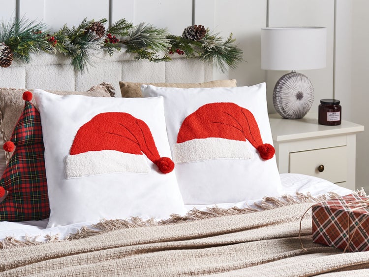 Zierkissen mit Weihnachtsmotiven. Bringen Sie festliche Stimmung in Ihr Zuhause mit diesem Set aus zwei dekorativen Kissen, die mit einem verspielten, gestickten Weihnachtsmannhut verziert sind. Die strahlend weißen Bezüge unterstreichen das bezaubernde Design und verleihen jedem Raum einen Hauch von Weihnachtszauber. Ideal für Sofas, Stühle oder Betten, schaffen diese Kissen eine warme, weihnachtliche Atmosphäre. Dank der abnehmbaren Bezüge und des verdeckten Reißverschlusses sind sie leicht zu reinigen und somit eine praktische und zugleich stilvolle Ergänzung Ihrer Weihnachtsdekoration. Details: Typ Dekokissen. Farbe: Weiß. Farbton: Cremeweiß. Material: Stoff. Material: Baumwolle. Füllmaterial: Polyester. Zusammenstellung: 100% Baumwolle. Form: Quadratisch. Handgefertigt: Nein. Muster: Weihnachtsmotiv. Abmessungen: Tiefe: 45 cm. Breite: 45 cm. Höhe: 8 cm. Füllgewicht: 0.4 kg. Gewicht: 0.5 kg. .Sie kaufen: 2 x Zierkissen. Produktvorteile: Perfekt als saisonale Dekoration, Dekorativ und zugleich funktional, Erzeugt Wohlfühlcharakter in jedem Raum, Tolle Geschenkidee, Hochwertiges Material, Abnehmbare Bezüge. Montage: Benötigt keine Montage. Zusatzinformationen: Das Kissen ist vakuumverpackt. Nehmen Sie Ihr Kissen aus der Verpackung heraus und lassen Sie es 24 Stunden lang liegen, bis es seine volle Dichte erreicht. Pflegeanleitung: Baumwolle: 1.Nur von Hand, mit kaltem Wasser und milden Reinigungsmitteln waschen. 2.Bitte nicht im Trockner trocknen und auch nicht bügeln.