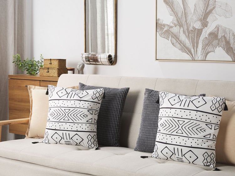 Quadratische Dekokissen mit Quasten. Ihr Lieblingszimmer verdient moderne Dekorationselemente und auffällige Akzentstücke. Statten Sie es mit diesen quadratischen Kissen aus, die dank ihres Samtbezugs leicht zu reinigen sind. Sie haben ein geometrisches Muster auf der Vorderseite und farblich abgestimmte Quasten an jeder Ecke. Dank des Designs lassen sie sich leicht in viele verschiedene Einrichtungsstile einfügen – von modern über Boho bis zum skandinavischen Stil. Details: Typ Dekokissen. Farbe: Weiß. Material: Stoff. Material: Samtstoff. Füllmaterial: Polyester. Zusammenstellung: 100% Polyester. Form: Quadratisch. Handgefertigt: Nein. Muster: Geometrisches Muster. Abmessungen: Tiefe: 45 cm. Breite: 45 cm. Höhe: 7 cm. Füllgewicht: 0.4 kg. Gewicht: 0.5 kg. .Sie kaufen: 2 x Zierkissen. Produktvorteile: Wunderbar geeignet für Schlaf- und Wohnbereich, Dekorativ und zugleich funktional, Modernes Design, Hochwertiges Material, Besonders pflegeleicht und langlebig, Abnehmbare Bezüge. Montage: Benötigt keine Montage. Zusatzinformationen: Das Kissen ist vakuumverpackt. Nehmen Sie Ihr Kissen aus der Verpackung heraus und lassen Sie es 24 Stunden lang liegen, bis es seine volle Dichte erreicht. Pflegeanleitung: Samtstoff: 1.Von Hand oder mit einem Feinwäsche-Programm bei max. 30°C waschen, wenn auf dem Etikett keine weiteren Hinweise des Herstellers gegeben sind. 2.Wenn auf dem Etikett nicht anders angegeben, bitte nicht im Trockner trocknen und auch nicht bügeln.