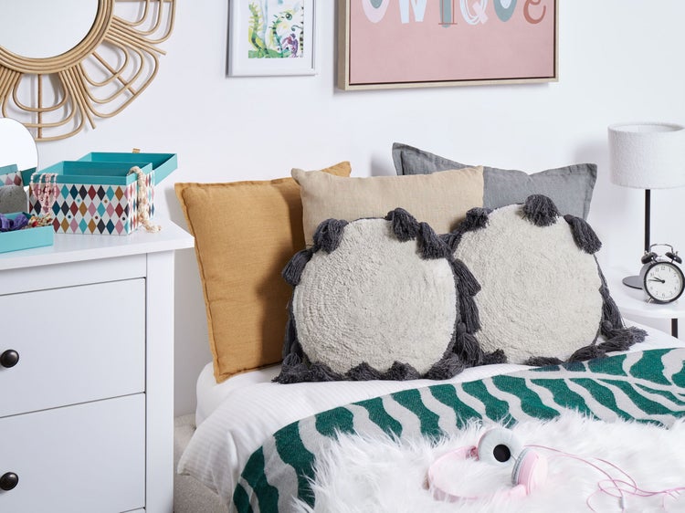 Baumwollkissen mit grauen Fransen. Verleihen Sie dem Kinderzimmer mit diesem Set aus zwei runden Kissen einen Hauch von Gemütlichkeit. Die Kissen sind aus weicher, strapazierfähiger Baumwolle gefertigt und eignen sich perfekt zum Kuscheln oder als zusätzliche Bequemlichkeit für jedes Zimmer. Jedes Kissen ist mit verspielten dunkelgrauen Quasten verziert, die den optischen Gesamteindruck abrunden und das Kissen zu einer stilvollen und praktischen Wahl für jedes Kinderzimmer machen. Die plüschige Füllung sorgt für maximalen Komfort, während die neutralen, sanften Weißtöne leicht zu verschiedenen Einrichtungsstilen passen. Ideal für Leseecken, Spielecken oder als reizende Ergänzung zur Bettausstattung. Details: Typ Dekokissen. Farbe: Weiß. Farbton: Cremeweiß. Material: Stoff. Material: Baumwolle. Füllmaterial: Polyester. Zusammenstellung: 100% Baumwolle. Form: Rund. Handgefertigt: Ja. Muster: Ohne Muster. Abmessungen: Tiefe: 40 cm. Breite: 40 cm. Höhe: 4 cm. Füllgewicht: 0.35 kg. Gewicht: 0.7 kg. .Sie kaufen: 2 x Zierkissen. Produktvorteile: Handgefertigt mit viel Liebe zum Detail, Exquisites Gewebe, Passt harmonisch in jedes Kinderzimmer, Dekorativ und zugleich funktional, Abnehmbare und waschbare Kissenbezüge. Montage: Benötigt keine Montage. Zusatzinformationen: Das Kissen ist vakuumverpackt. Nehmen Sie Ihr Kissen aus der Verpackung heraus und lassen Sie es 24 Stunden lang liegen, bis es seine volle Dichte erreicht. Pflegeanleitung: Baumwolle: 1.Nur von Hand, mit kaltem Wasser und milden Reinigungsmitteln waschen. 2.Bitte nicht im Trockner trocknen und auch nicht bügeln.