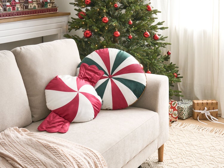 Weihnachtskissen in Bonbonform. Dieses Set aus zwei Weihnachtskissen sorgt für Farbe und Gemütlichkeit in Ihrem Zuhause. Das verspielte Bonbon-Design bringt eine fröhliche, festliche Stimmung in jeden Raum, und der weiche Samtstoff lädt in den kälteren Monaten zum Kuscheln ein. So werden die Kissen schnell zu einem Liebling Ihrer Weihnachtsdekoration. Details: Typ Dekokissen. Farbe: Weiß. Material: Stoff. Material: Samtstoff. Füllmaterial: Polyester. Zusammenstellung: 100% Polyester. Form: Rund. Handgefertigt: Nein. Muster: Weihnachtsmotiv. Abmessungen: Tiefe: 40/55 cm. Breite: 40/55 cm. Höhe: 8 cm. Füllgewicht: 0.7 kg. Gewicht: 1 kg. .Sie kaufen: 2 x Zierkissen. Produktvorteile: Perfekt als saisonale Dekoration, Tolle Geschenkidee, Erzeugt Wohlfühlcharakter in jedem Raum, Hohe Qualität. Montage: Benötigt keine Montage. Zusatzinformationen: Das Kissen ist vakuumverpackt. Nehmen Sie Ihr Kissen aus der Verpackung heraus und lassen Sie es 24 Stunden lang liegen, bis es seine volle Dichte erreicht. Bitte beachten Sie, dass Samtstoff unter verschiedenen Lichtverhältnissen eine andere Optik haben kann – das Material schimmert bei Tageslicht stärker und wirkt bei künstlicher Beleuchtung in Innenräumen eher gedämpft. Aufgrund der glatten, hochdichten Struktur des Gewebes kann sein Farbton auch variieren, wenn man mit der Hand in verschiedene Richtungen und Winkel über den Stoff fährt. Um den Farbton auszugleichen und Druckstellen zu vermeiden, sollte der Webstoff sanft mit einer offenen Handfläche in eine Richtung gestrichen, mit einem feuchten Tuch abgewischt oder einem Dampfbügeleisen gebügelt werden. Pflegeanleitung: Samtstoff: 1.Flecken können mit einem Polsterreiniger, einem angefeuchteten Schwamm oder milden Reinigungsmitteln entfernt werden. 2.Oberflächen nur mit geeignetem Aufsatz vorsichtig absaugen.