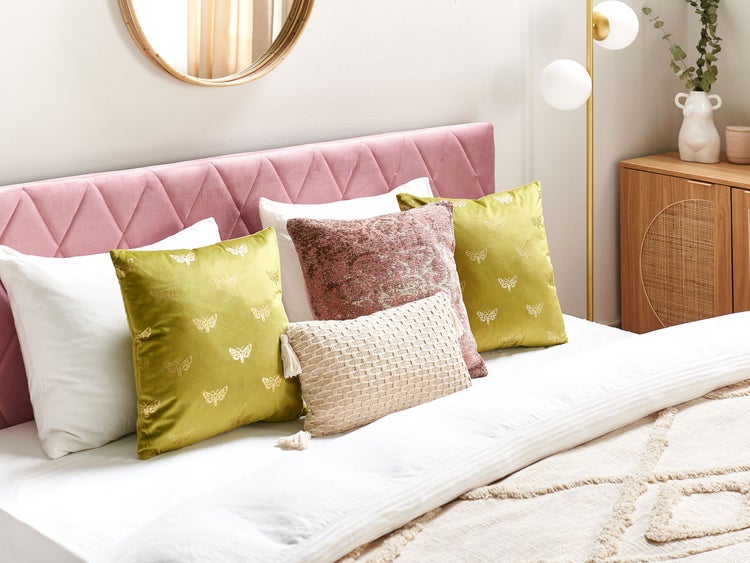 Moderne Samtkissen mit goldenem Schmetterlingsmotiv. Verleihen Sie Ihrem Zuhause mit diesem Kissen-Set einen eleganten und gemütlichen Look. Die Bezüge sind aus Samt gefertigt und mit einem Foliendruck verziert. Die Kissen haben eine weiche Füllung und einen praktischen Reißverschluss. Dank des schönen Schmetterlingsmusters verleiht das Kissenset jedem modernen und traditionellen Einrichtungsstil Charme. Details: Typ Dekokissen. Farbe: Grün. Farbton: Hellgrün. Material: Stoff. Material: Samtstoff. Füllmaterial: Polyester. Zusammenstellung: 100% Polyester. Form: Quadratisch. Handgefertigt: Nein. Muster: Tiermuster. Abmessungen: Tiefe: 45 cm. Breite: 45 cm. Höhe: 10 cm. Füllgewicht: 0.45 kg. Gewicht: 0.6 kg. .Sie kaufen: 2 x Zierkissen. Produktvorteile: Wunderbar geeignet für Schlaf- und Wohnbereich, Auffälliges, dekoratives Muster, Verleiht jedem Raum eine einzigartige Note, Seidenweicher, geschmeidiger Stoff, Abnehmbare Bezüge, In der Waschmaschine als Ganzes waschbar. Montage: Benötigt keine Montage. Zusatzinformationen: Das Kissen ist vakuumverpackt. Nehmen Sie Ihr Kissen aus der Verpackung heraus und lassen Sie es 24 Stunden lang liegen, bis es seine volle Dichte erreicht. Bitte beachten Sie, dass Samtstoff unter verschiedenen Lichtverhältnissen eine andere Optik haben kann – das Material schimmert bei Tageslicht stärker und wirkt bei künstlicher Beleuchtung in Innenräumen eher gedämpft. Aufgrund der glatten, hochdichten Struktur des Gewebes kann sein Farbton auch variieren, wenn man mit der Hand in verschiedene Richtungen und Winkel über den Stoff fährt. Um den Farbton auszugleichen und Druckstellen zu vermeiden, sollte der Webstoff sanft mit einer offenen Handfläche in eine Richtung gestrichen, mit einem feuchten Tuch abgewischt oder einem Dampfbügeleisen gebügelt werden. Pflegeanleitung: Samtstoff: 1.Nur von Hand, mit kaltem Wasser und milden Reinigungsmitteln waschen. 2.Bitte nicht im Trockner trocknen und auch nicht bügeln.