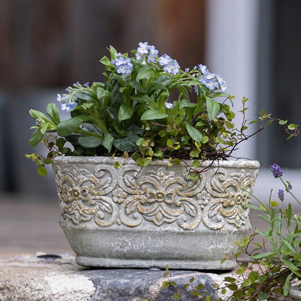 Pflanzer Ornament oval, gefertigt aus Zement in grau / weiß im trendigen Antik Look; Ornament mit Goldakzenten; möbelschonende Kunststoffnoppen an der Unterseite. Maße ca.: L 21 x B 12 x H 11 cm. Nicht frostsicher. Lieferung ohne Deko