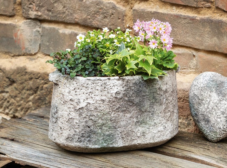 Pflanzer Stone in Steinoptik, gefertigt aus Steingut in verwitterter Optik, schwere Qualität. Zum Bepflanzen mit Folie ausschlagen. Möbelschonende Kunststoffnoppen an der Unterseite. Nicht frostsicher. Maße ca.: L 26 x B 15 x H 15 cm. Lieferung ohne Deko.