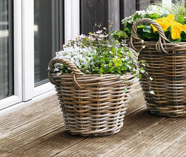 Pflanzkorb Rattan, klein, in trendiger Optik. Seitliche Griffe. Dezent grau gekalktes Rattan stabil verflochten. Ausgeschlagen mit Folie, zum Bepflanzen geeignet. Maße ca.: obere Öffnung Ø 30 cm; Bodendurchmesser Ø 18 cm; Höhe mit Henkel 28 cm; ohne Henkel 23 cm. Hergestellt in Handarbeit. Lieferung ohne Deko.
