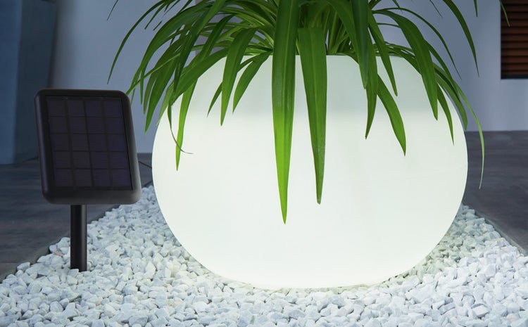 LED-Solarpflanzer Lights. Dekorativer Lichtakzent aus weißem Kunststoff zum Bepflanzen. 16 warmweiß leuchtende LED, 7 wählbare Farben mit weich fließender Farbwechselfunktion. An-/Aus-Schalter. Inkl. Batterie; Erdspieß für Solarpanel aus schwarzem Kunststoff. Maße ca.: Ø 35 cm, Panelzuleitung 2 Meter. Für den Außenbereich geeignet. Lieferung ohne Pflanze und Deko.