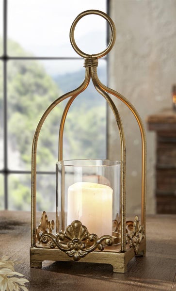 Dekoleidenschaft Windlicht Ornament aus Metall in gold in Antik Optik, 32 cm hoch, Kerzenhalter zum Aufängen oder Hinstellen, Hängewindlicht