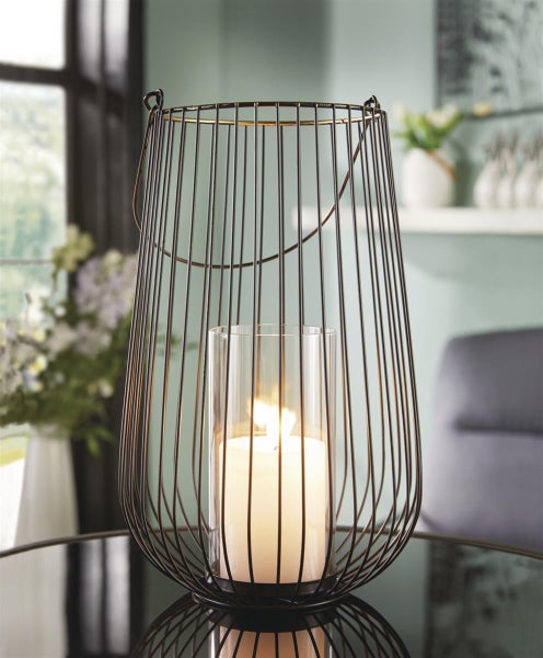 Windlicht Retro groß aus mattschwarz lackiertem Metall mit Goldrand und Glaswindlicht. Tauchen Sie Ihr Zuhause in ein warmes und nostalgisches Licht mit unserem Windlicht Retro im großen Format. Dieser kunstvoll gestaltete Kerzenhalter vereint Retro-Charme mit moderner Eleganz und ist eine perfekte Ergänzung für Ihre Wohnraumdekoration. Die Stuktur der Laterne besteht aus mattschwarz lackierten Metallstäben, die zu einem klassischen Design geformt wurden und dem Windlicht eine zeitlose Ästhetik verleihen. Am oberen Abschluss befindet sich ein goldener Rand, der dem Windlicht einen Hauch von Luxus und Raffinesse verleiht. Ein herausnehmbares Glaswindlicht ist in der Mitte des Kerzenhalters platziert und sorgt für eine sichere Umgebung für Ihre Kerze. Der Glaszylinder hat einen Durchmesser von ca. 8 cm und eine Höhe von ca. 16 cm, was ausreichend Platz auch für große Stumpenkerzen oder XXL Teelichter (max. Durchmesser 8 cm) bietet. Mit Maßen von ca. Ø 19 cm und einer Höhe von 31 cm ist dieser Kerzenständer ein beeindruckendes Dekorationsstück, das auf Sideboards, Fensterbänken oder Esstischen einen imposanten Blickfang darstellt. Dank des umlegbaren Henkels kann das Tischwindlicht auch als Hängelaterne verwendet werden und ist leicht zu transportieren und aufzuhängen. Bringen Sie mit unserem Windlicht Retro groß einen Hauch von Nostalgie und Eleganz in Ihr Zuhause und schaffen Sie eine stimmungsvolle Atmosphäre, die zum Entspannen und Genießen einlädt. Perfekt für Liebhaber von Vintage-Designs und anspruchsvoller Wohnkultur, wird dieses Windlicht sicherlich bewundernde Blicke auf sich ziehen und Ihre Räume mit einem warmen Glanz erfüllen. Die Lieferung erfolgt ohne Kerze und Dekoration.