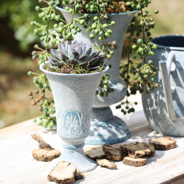 Dieser dekorative Metallkelch begeistert mit seinem eleganten Design und seiner rustikalen Oberflächenstruktur. Sein Charakter und die mit Liebe zum Detail gestalteten künstlichen Altersspuren machen ihn zu einem echten Blickfang für jeden Raum. Mit einer Höhe von 17,5 cm und einem breiten Kelchdurchmesser bietet dieses vielseitige Deko-Element ausreichend Platz für verschiedenste Gestaltungsmöglichkeiten. Gefertigt aus hochwertigem Metall, ist der Kelch nicht nur langlebig, sondern auch stabil und funktional. Die matte, strukturierte Oberfläche strahlt schlichte Eleganz aus und lässt sich ideal mit unterschiedlichen Einrichtungsstilen wie Shabby Chic, Landhaus oder Boho kombinieren. Die harmonische Optik verleiht Ihrer Dekoration eine zeitlose Note, während die zarte Verzierung einen Hauch von Vintage-Charme vermittelt. Dieser Metallkelch eignet sich hervorragend als dekoratives Element für besondere Anlässe wie Hochzeiten oder Feierlichkeiten. Er kann liebevoll mit Blumenarrangements, Kunstblumen oder Trockenblumen bestückt werden und schafft eine eindrucksvolle Präsentation. Nutzen Sie ihn auch als Dekopokal, um Ihre kreativen DIY-Projekte in Szene zu setzen. Dank der großzügigen Tiefe von 14 cm können auch umfangreichere Pflanzen- oder Dekoelemente stilvoll darin platziert werden. Besonders harmonisch wirkt dieser Kelch in Kombination mit weiteren dekorativen Elementen wie Kerzenhaltern, Moos oder farbigen Glassteinen. Für ein abgestimmtes Ambiente lassen sich passende Accessoires aus dem Sortiment von uns ergänzen, um ein harmonisches Gesamtbild zu schaffen. Ob als dekorativer Akzent in Wohnräumen, rustikales Highlight im Garten oder stimmungsvolle Tischdekoration – dieser Metallkelch wird Ihre Dekorationsideen auf ein neues Niveau heben. Schaffen Sie eine Atmosphäre voller Harmonie und Eleganz mit diesem vielseitigen Deko-Kelch, der Ihre Umgebung dauerhaft verschönert. Bitte beachten Sie: Dieses Produkt wird aus verzinktem, nachbehandeltem Stahlblech gefertigt. Wir können dennoch nicht garantieren, dass es zu 100 % rostfrei und wasserdicht ist. Auf Produktbildern abgebildetes Zubehör und Deko-Artikel sind in der Lieferung nicht enthalten. Höhe: ca. 17,5cm Durchmesser: ca. Ø11cm Pflanztiefe: ca. 14cm Öffnung: ca. 10cm – 5cm Stellfläche: ca. Ø7,5cm Farbe: Weiß/Blau Material: Metall Menge: 1 Stück Anb.Nr.: 19184 EAN: 4067555191849