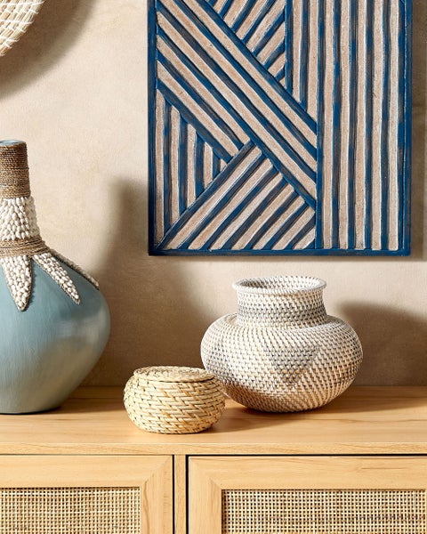 Dekorative Vase im natürlichen Stil . Diese handgeflochtene Vase aus Rattan fügt sich als raffinierte, aber auffällige Dekoration perfekt in moderne Einrichtungen ein. Ein heller und warmer Farbton aus Holz in Kombination mit ineinander verflochtenen Details in Weiß und Grau verleihen der Vase einen natürlichen Stil, der derzeit ganz oben auf der Liste der Einrichtungstrends steht. Um das natürliche Design zu unterstreichen, können Sie getrocknetes Ziergras in die Vase stellen. Details: Typ Dekovase. Stil: Boho. Farbe: Weiß. Material: Rattan. Material: Rattan. Zusätzliches Material: Kunststoff. Finish: Lackiert. Handgefertigt: Ja. Abmessungen: Tiefe: 24 cm. Breite: 24 cm. Höhe: 22 cm. Gewicht: 0.4 kg. .Sie kaufen: 1 x Vase. Produktvorteile: Handgefertigt mit viel Liebe zum Detail, Gemütliche Ausstrahlung, Wunderbar geeignet für Schlaf- und Wohnbereich, Ein einzigartiger Hingucker, Hochwertiges Material. Montage: Benötigt keine Montage. Zusatzinformationen: Die Vase hat ausschließlich eine dekorative Funktion. Es wird empfohlen, nur Dekorationen und Blumen aufzubewahren, die keinen Kontakt mit Wasser erfordern, Bitte beachten Sie, dass jedes Produkt handgefertigt ist. Abweichungen in Struktur, Farbe oder Form können aufgrund der Eigenschaften der verwendeten Materialien auftreten und stellen keinen Qualitätsmangel dar. Pflegeanleitung: Rattan: 1.Die Reinigung sollte ausschließlich mit einem weichen, trockenen Tuch und ohne Reinigungsmittel erfolgen.