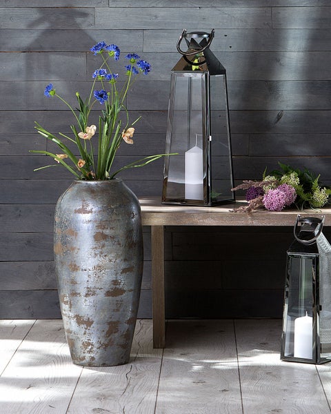 Formschöne Vase mit schöner Oberfläche. Ein universelles Accessoire mit eleganter Note - diese kegelförmige Vase kann vielseitig in unterschiedlichen Wohnräumen eingesetzt werden, ob in Kombination mit anderen Dekovasen oder einzeln. Ihre glänzende Oberfläche in Dunkelgrau verleiht der Vase eine ganz besondere, edle Note, wodurch sie auch ohne floralen Inhalt zum dekorativen Blickfang wird. Details: Typ Dekovase. Farbe: Grau. Farbton: Dunkelgrau. Material: Keramik. Material: Terrakotta. Handgefertigt: Ja. Abmessungen: Tiefe: 27 cm. Breite: 27 cm. Höhe: 48 cm. Gewicht: 7 kg. .Sie kaufen: 1 x Vase. Produktvorteile: Elegante Akzente für Ihr Heim, Erzeugt Wohlfühlcharakter in jedem Raum, Handgefertigte Präzision, Besonders pflegeleicht und langlebig, Präzise ausgearbeitete Details. Montage: Benötigt keine Montage. Zusatzinformationen: Die Vase hat ausschließlich eine dekorative Funktion. Es wird empfohlen, nur Dekorationen und Blumen aufzubewahren, die keinen Kontakt mit Wasser erfordern Pflegeanleitung: Terrakotta: 1.Bitte ausschließlich milde Reinigungsmittel und weiche Tücher verwenden. Feuchte Stellen sofort trocken reiben.