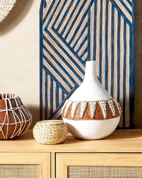 Handgefertigte Vase mit dekorativem Muster. Diese stilvolle, handgefertigte Vase ist ein echter Blickfang für Ihre Einrichtung. Das aus Terrakotta gefertigte und mit natürlicher Rinde und Muscheln verzierte Stück passt zu einer Vielzahl von Einrichtungen von Boho bis rustikal. Stellen Sie Trockenblumen oder Dekoblumen hinein oder lassen Sie es leer stehen. Details: Typ Dekovase. Farbe: Weiß. Material: Keramik. Material: Terrakotta. Zusätzliches Material: Muscheln. Finish: Lackiert. Handgefertigt: Ja. Abmessungen: Tiefe: 26 cm. Breite: 26 cm. Höhe: 33 cm. Gewicht: 2 kg. .Sie kaufen: 1 x Vase. Produktvorteile: Ein einzigartiger Hingucker, Auffälliges, dekoratives Muster, Nur für Innenräume geeignet, Handgefertigte Präzision, Besonders pflegeleicht. Montage: Benötigt keine Montage. Zusatzinformationen: Die Vase hat ausschließlich eine dekorative Funktion. Es wird empfohlen, nur Dekorationen und Blumen aufzubewahren, die keinen Kontakt mit Wasser erfordern, Bitte beachten Sie, dass jedes Produkt handgefertigt ist. Abweichungen in Struktur, Farbe oder Form können aufgrund der Eigenschaften der verwendeten Materialien auftreten und stellen keinen Qualitätsmangel dar. Pflegeanleitung: Terrakotta: 1.Bitte ausschließlich milde Reinigungsmittel und weiche Tücher verwenden. Feuchte Stellen sofort trocken reiben.