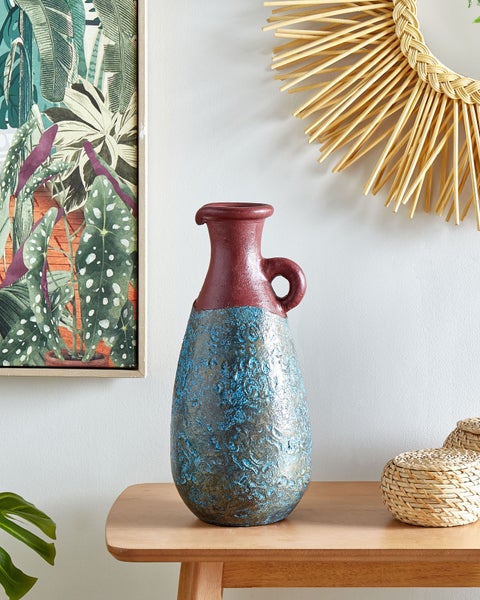 Handgefertigte Terrakotta-Vase im antiken Stil. Diese handgefertigte Vase aus hochwertigem Terrakotta ist eine einzigartige Dekoration, die einen rustikalen und charmanten Touch in Ihr Zuhause bringen wird. Der abgenutzte, verwitterte Effekt verleiht Ihrem Wohn- oder Schlafzimmer einen einzigartigen Charakter. Verwenden Sie sie einzeln oder kombinieren Sie die Dekovase mit anderen Produkten, um ein stimmiges Gesamtbild zu schaffen. Details: Typ Dekovase. Farbe: Blau. Material: Keramik. Material: Terrakotta. Finish: Handgemalt. Handgefertigt: Ja. Abmessungen: Tiefe: 23 cm. Breite: 23 cm. Höhe: 40 cm. Gewicht: 3.4 kg. .Sie kaufen: 1 x Vase. Produktvorteile: Ein einzigartiger Hingucker, Wunderbar geeignet für Schlaf- und Wohnbereich, Retro Stil, Handgefertigte Präzision, Die Unterlage schützt vor Oberflächenkratzern. Montage: Benötigt keine Montage. Zusatzinformationen: Die Vase hat ausschließlich eine dekorative Funktion. Es wird empfohlen, nur Dekorationen und Blumen aufzubewahren, die keinen Kontakt mit Wasser erfordern, Bitte beachten Sie, dass jedes Produkt handgefertigt ist. Abweichungen in Struktur, Farbe oder Form können aufgrund der Eigenschaften der verwendeten Materialien auftreten und stellen keinen Qualitätsmangel dar. Der sichtbare Alterungseffekt, sowie jede Art von Verfärbung oder Abnutzung sind absichtlich und stellen keinen Qualitätsmangel des Produkts dar. Pflegeanleitung: Terrakotta: 1.Bitte ausschließlich milde Reinigungsmittel und weiche Tücher verwenden. Feuchte Stellen sofort trocken reiben.