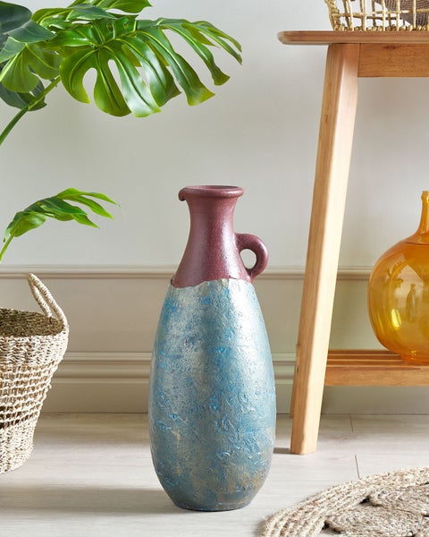 Handgefertigte Terrakotta-Vase im antiken Stil. Diese handgefertigte Vase aus hochwertigem Terrakotta ist eine einzigartige Dekoration, die einen rustikalen und charmanten Touch in Ihr Zuhause bringen wird. Der abgenutzte, verwitterte Effekt verleiht Ihrem Wohn- oder Schlafzimmer einen einzigartigen Charakter. Verwenden Sie sie einzeln oder kombinieren Sie die Dekovase mit anderen Produkten, um ein stimmiges Gesamtbild zu schaffen. Details: Typ Dekovase. Farbe: Blau. Material: Keramik. Material: Terrakotta. Finish: Handgemalt. Handgefertigt: Ja. Abmessungen: Tiefe: 20 cm. Breite: 20 cm. Höhe: 50 cm. Gewicht: 4.6 kg. .Sie kaufen: 1 x Vase. Produktvorteile: Ein einzigartiger Hingucker, Wunderbar geeignet für Schlaf- und Wohnbereich, Retro Stil, Handgefertigte Präzision, Die Unterlage schützt vor Oberflächenkratzern. Montage: Benötigt keine Montage. Zusatzinformationen: Die Vase hat ausschließlich eine dekorative Funktion. Es wird empfohlen, nur Dekorationen und Blumen aufzubewahren, die keinen Kontakt mit Wasser erfordern, Bitte beachten Sie, dass jedes Produkt handgefertigt ist. Abweichungen in Struktur, Farbe oder Form können aufgrund der Eigenschaften der verwendeten Materialien auftreten und stellen keinen Qualitätsmangel dar. Der sichtbare Alterungseffekt, sowie jede Art von Verfärbung oder Abnutzung sind absichtlich und stellen keinen Qualitätsmangel des Produkts dar. Pflegeanleitung: Terrakotta: 1.Bitte ausschließlich milde Reinigungsmittel und weiche Tücher verwenden. Feuchte Stellen sofort trocken reiben.