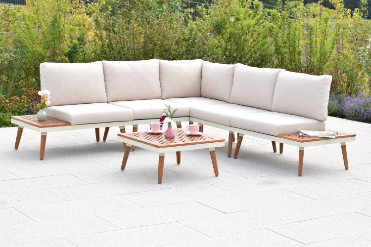 Verleihen Sie Ihrem Outdoor-Bereich mit dem eleganten Delphi Eckset einen Hauch von Luxus und Stil. Die Kombination aus einem weißen Aluminiumgestell, beigefarbenen Kissen und geölten Akazienholz schafft eine einladende Atmosphäre.
