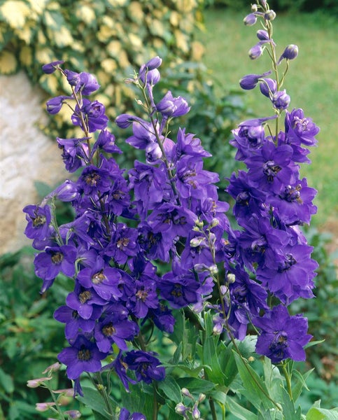 Delphinium Pacific ‘Black Knight’, der edle Rittersporn, setzt als imposante Gartenstaude eindrucksvolle Akzente mit tiefvioletten bis fast schwarz wirkenden Blütenkerzen. Die aufrecht wachsenden, kerzenförmigen Rispen thronen über frischgrünem, handförmig geteiltem Laub und erreichen je nach Standort beachtliche Höhen, wodurch diese Prachtstaude ideal für die hinteren Bereiche im Staudenbeet und klassische Rabatten ist. Die Hauptblüte erscheint im Frühsommer, oft von Juni bis Juli, und nach einem beherzten Rückschnitt bildet die Sorte eine attraktive Nachblüte im Spätsommer. Als Solitär im Vorgarten, in Gruppenpflanzung im Bauerngarten oder als strukturgebende Beetstaude entfaltet ‘Black Knight’ besondere Wirkung; auch als edle Schnittblume ist der Rittersporn geschätzt. Ein sonniger, windgeschützter Standort fördert standfeste Blütenstiele, in heller Halbschattenlage bleibt die Farbe intensiv. Der Boden sollte nährstoffreich, humos und gut durchlässig sein, gleichmäßig feucht, jedoch frei von Staunässe. Eine mulchte Bodenoberfläche und regelmäßige Wassergaben während der Knospenbildung unterstützen die üppige Blüte, eine Stütze verhindert Umknicken bei Wind. Im Frühjahr sorgt eine organisch-mineralische Düngung für Vitalität, der Rückschnitt nach der ersten Blüte regt zur Remontierung an. In großen Pflanzgefäßen lässt sich ‘Black Knight’ als Kübelpflanze auf Terrasse oder geschütztem Balkon kultivieren, sofern das Substrat strukturstabil und nährstoffreich ist und überschüssiges Wasser gut abfließen kann. Diese langlebige Zierstaude bereichert jedes Gartenkonzept vom romantischen Blütenbeet bis zur eleganten Hintergrundpflanzung.